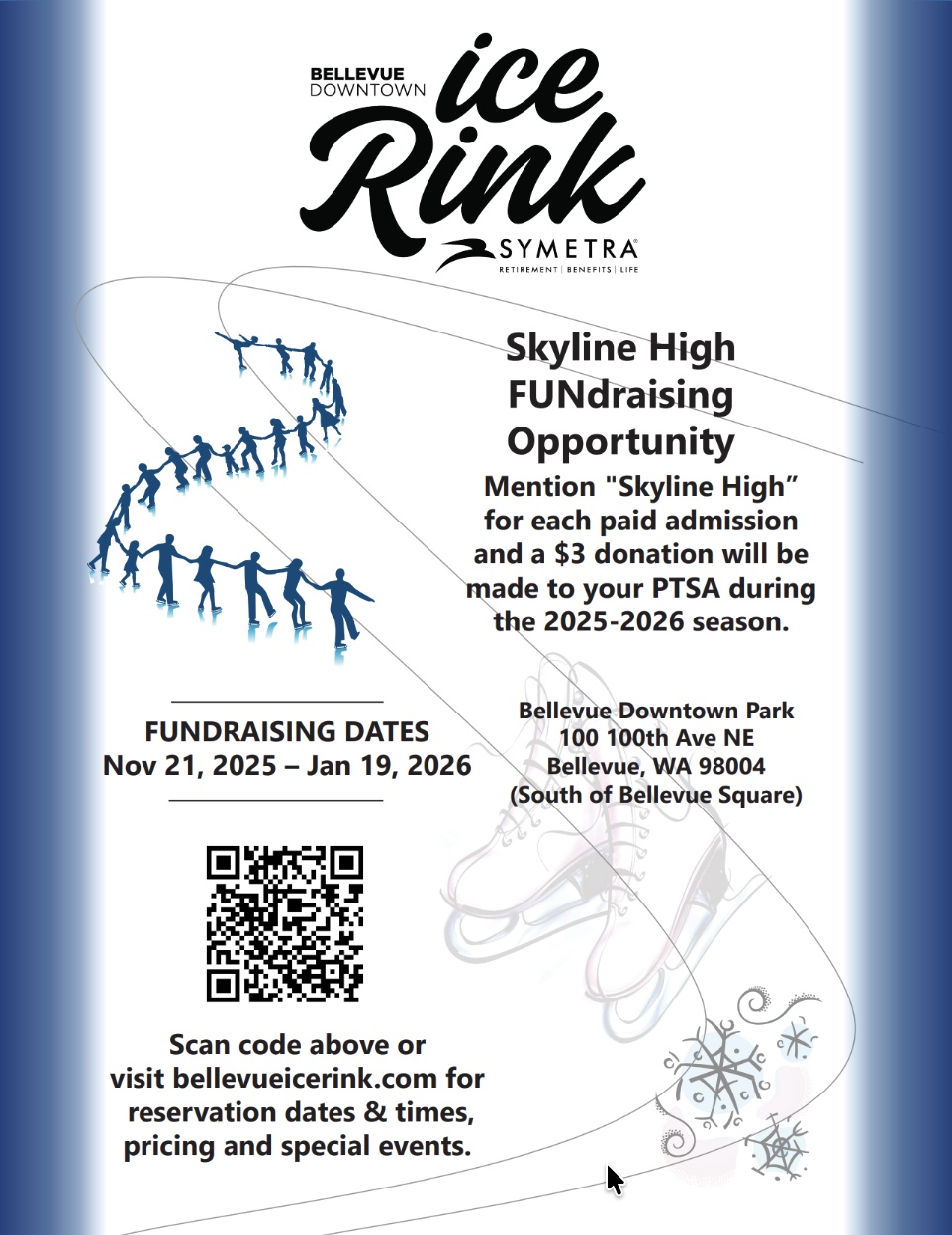 Support Skyline PTSA this holiday season at the Bellevue Downtown Ice Rink presented by Symetra! From Nov 21, 2025 – Jan 19, 2026, the rink will donate $3 per paid admission to Skyline PTSA when you mention “Skyline High School” at the admission counter.